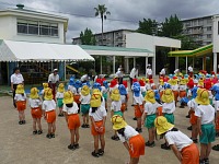 朝礼後、年中あじさい組さんは自分たちで植えた野菜チェック